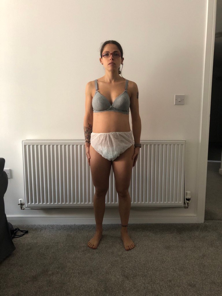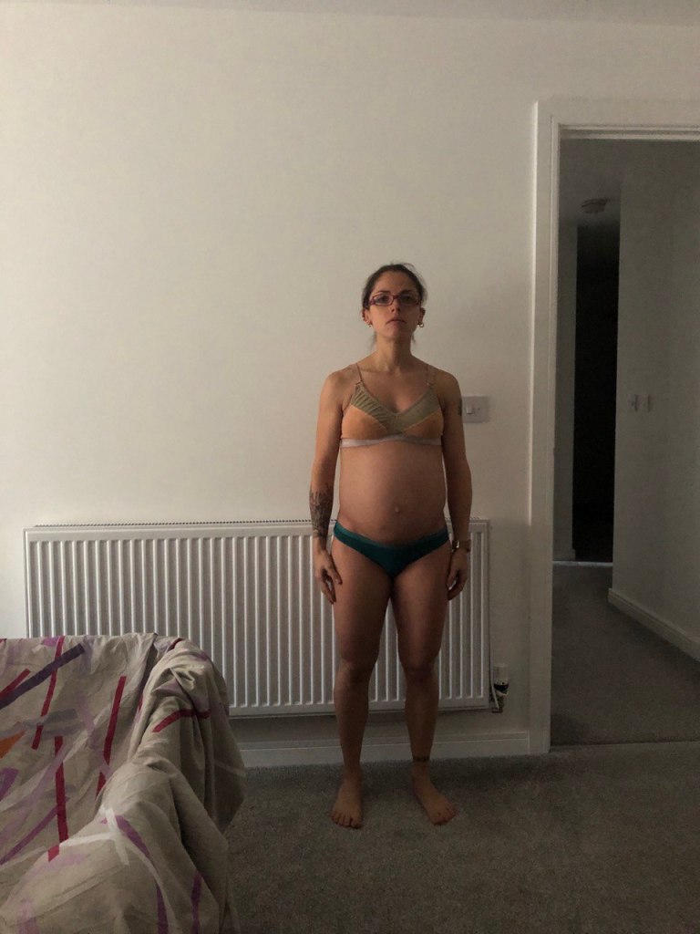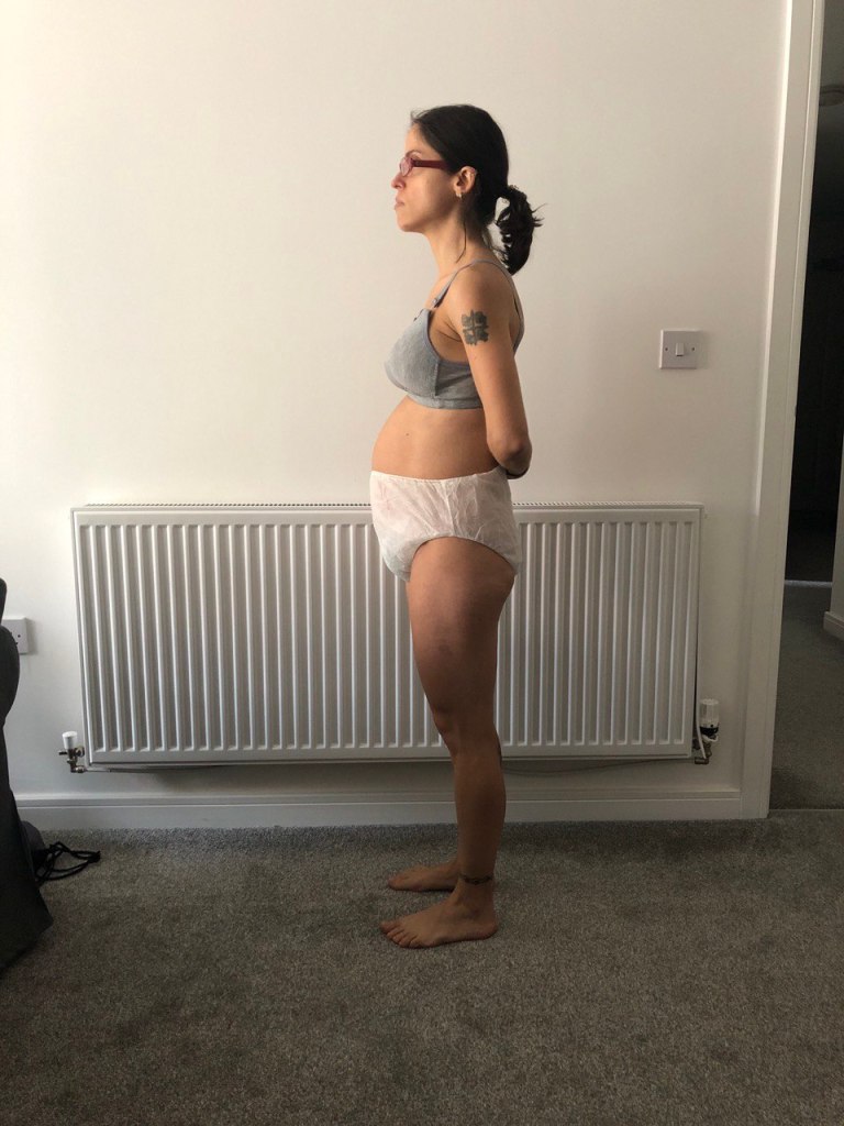 That’s the front perspective of my 41 weeks bump and 48 hours post-partum. I have no shame in showing my huge nanny’s underwear. My body is clearing out the system from everything I don’t need anymore in terms of connective tissues, blood, fluids etc, so I’m going to have a massive period dropping for at least a couple of weeks. That’s called lochia in medical term.