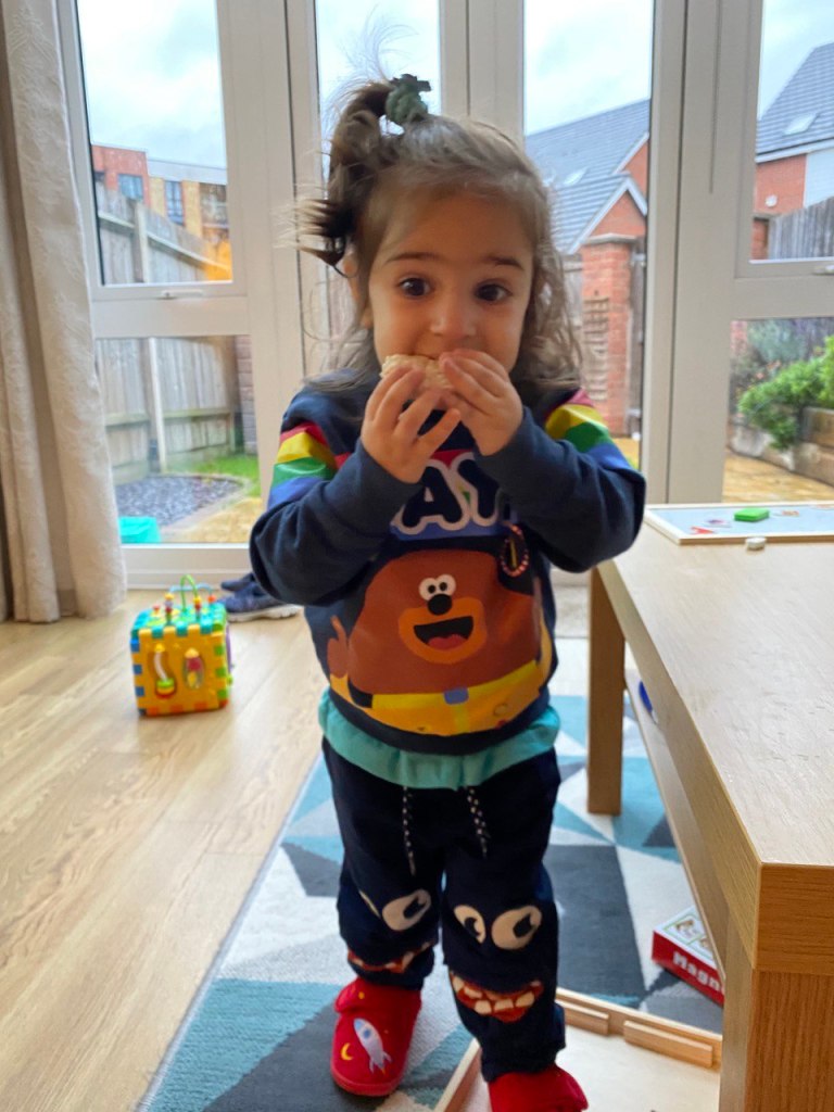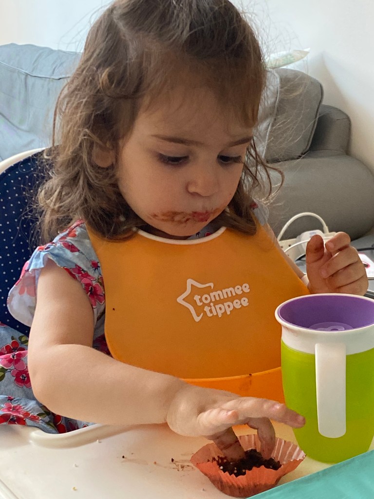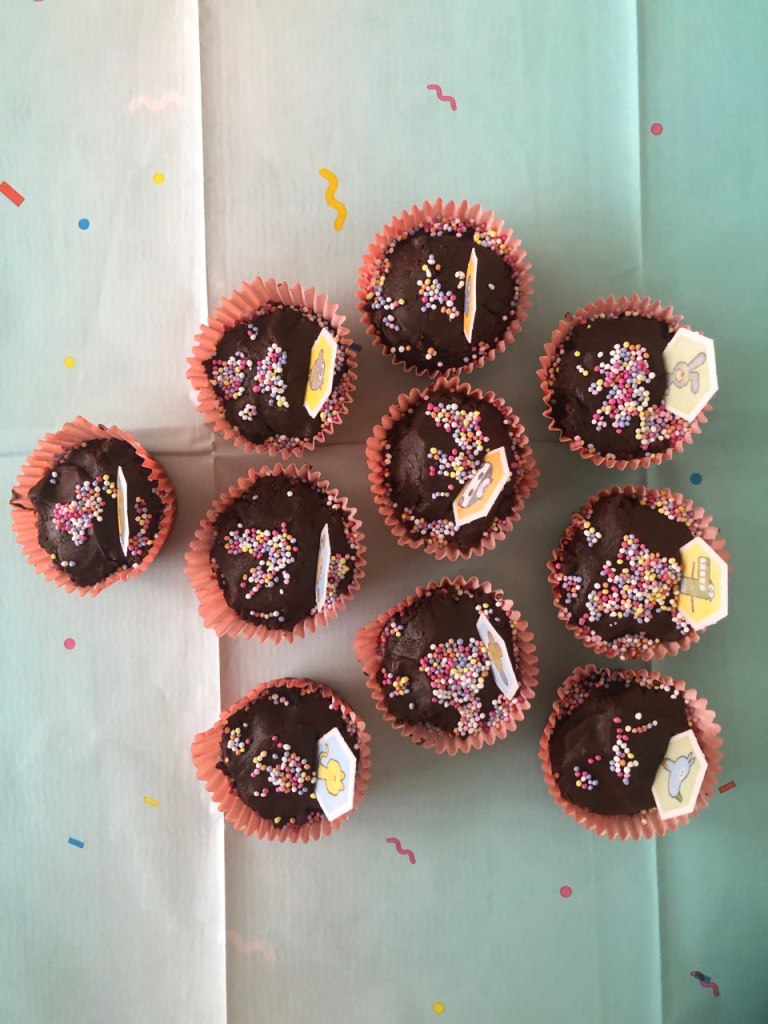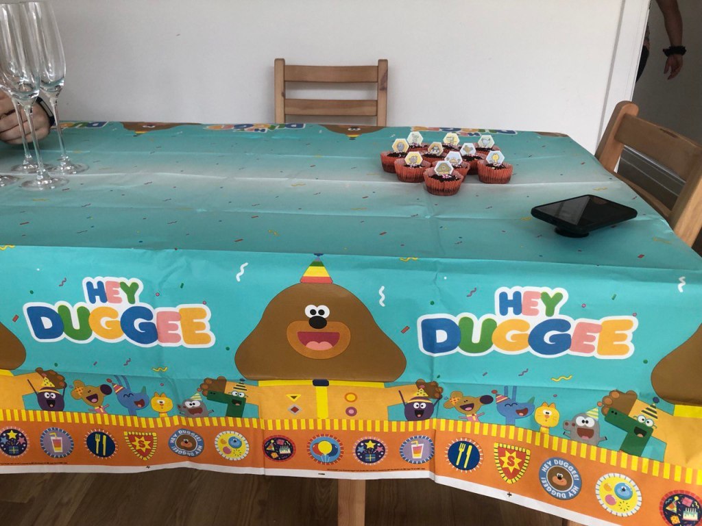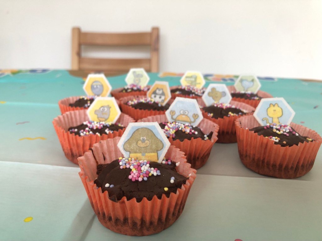 Sara and I baked a blueberry cake and chocolate muffins for the birthday party. Lavinia looked ecstatic when she found out that the living room and the food were all themed after her beloved Hey Duggee. She was on cloud nine: Duggee and the squirrels were everywhere, also on the yummy food!